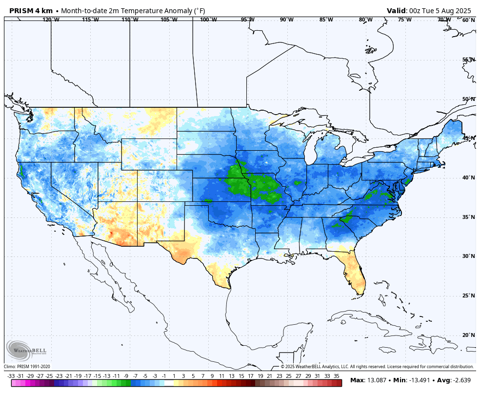 We’ve enjoyed a nice reprieve from the traditional conditions throughout the Dog Days of Summer. We’re running more than 3° below average to open the month, and large scale cooler than normal conditions have dominated throughout the eastern half of the country to open the month.